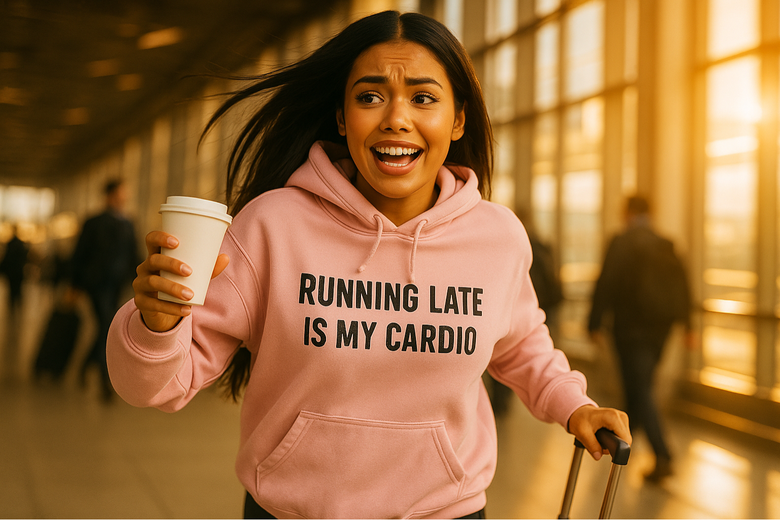 Wore the ‘Running Late Is My Cardio’ hoodie through ATL and three people stopped me to laugh. Even the flight attendant made a joke. Cozy, TSA-friendly, and worth every penny.